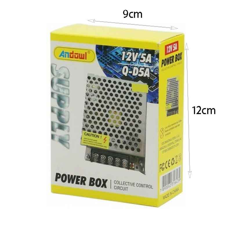Τροφοδοτικό σταθερής τάσης 12V και ρεύματος 5A από την Andowl, ιδανικό για κάμερες ασφαλείας, LED ταινίες, ηλεκτρονικές κατασκευές και συστήματα αυτοματισμού. Σχεδιασμένο με διάτρητο μεταλλικό περίβλημα για αποτελεσματική απαγωγή θερμότητας και προστασία από υπερφόρτωση και βραχυκύκλωμα.