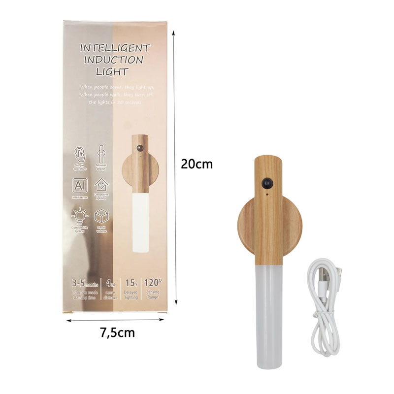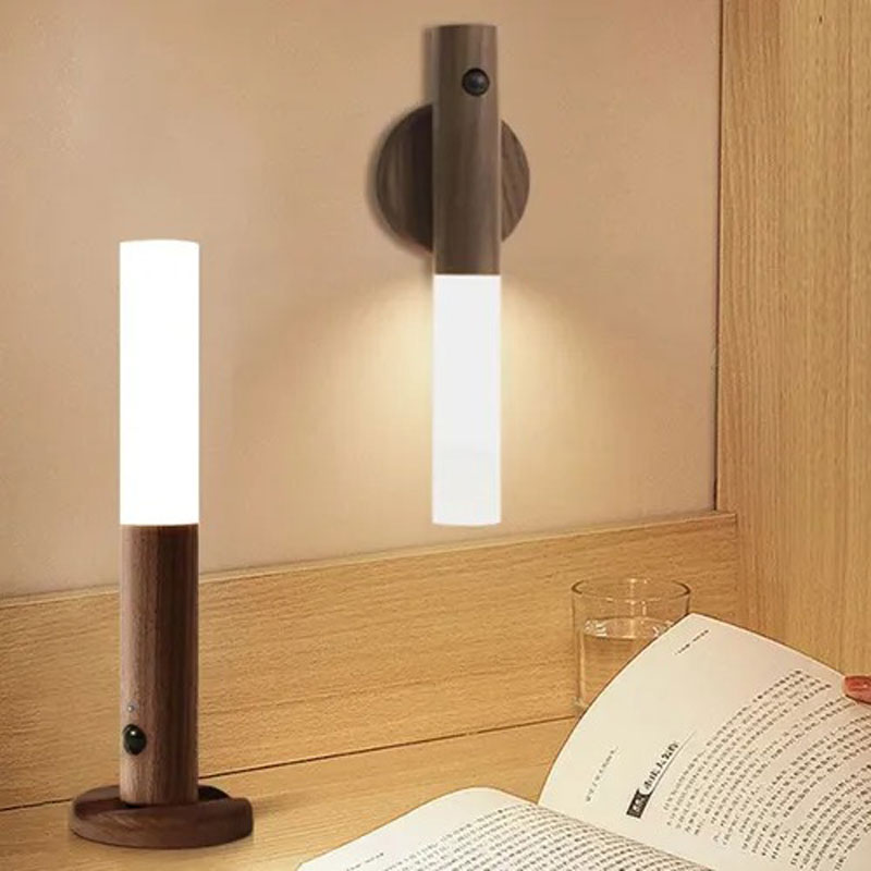 Διακοσμητικό φωτιστικό LED με μοντέρνα ξύλινη εμφάνιση και αισθητήρα κίνησης, ιδανικό για χρήση σε υπνοδωμάτιο, διάδρομο, σκάλες, ντουλάπες ή ακόμα και ως φορητό φωτιστικό χειρός. Ενεργοποιείται αυτόματα με την κίνηση και σβήνει μετά από 15 δευτερόλεπτα. Χάρη στη βάση με μαγνήτη, μπορεί να τοποθετηθεί εύκολα σε μεταλλικές επιφάνειες ή να χρησιμοποιηθεί ως επιτραπέζιο φωτιστικό.