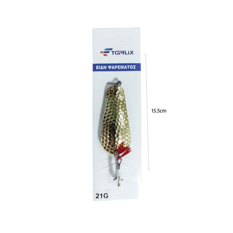 Αποδοτικό τεχνητό δόλωμα κουταλάκι (spoon lure) από την TOPFLIX, ιδανικό για θαλάσσιο και γλυκό νερό. Ο σχεδιασμός του προσελκύει τα ψάρια με έντονη κίνηση και αντανακλάσεις, ενώ το ζωηρό χρώμα ενισχύει την ορατότητα.