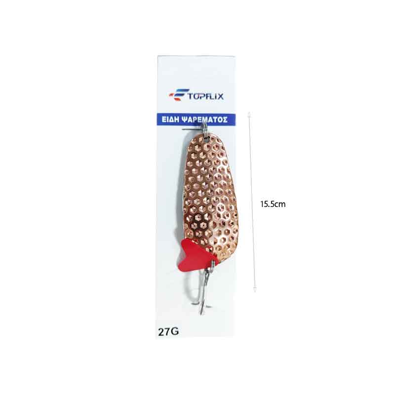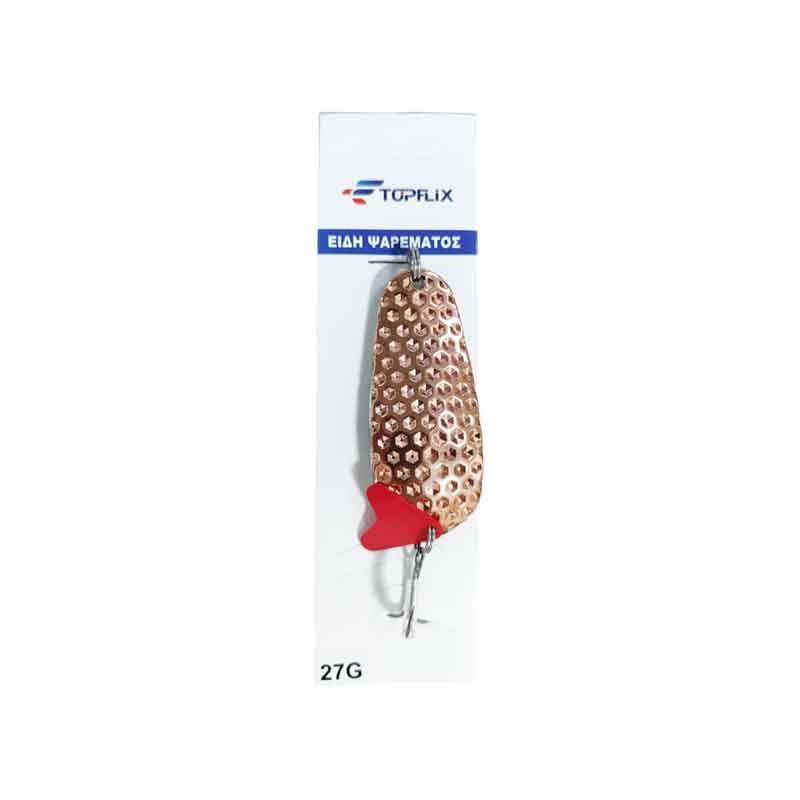 Αποδοτικό τεχνητό δόλωμα κουταλάκι (spoon lure) από την TOPFLIX, ιδανικό για θαλάσσιο και γλυκό νερό. Ο σχεδιασμός του προσελκύει τα ψάρια με έντονη κίνηση και αντανακλάσεις, ενώ το ζωηρό χρώμα ενισχύει την ορατότητα.