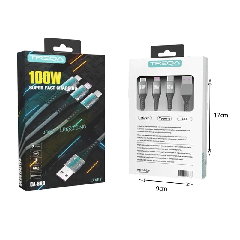 Treqa Καλώδια δεδομένων για γρήγορη φόρτιση 3 σε 1 CA-869 100W – Super fast data cables 3 in 1